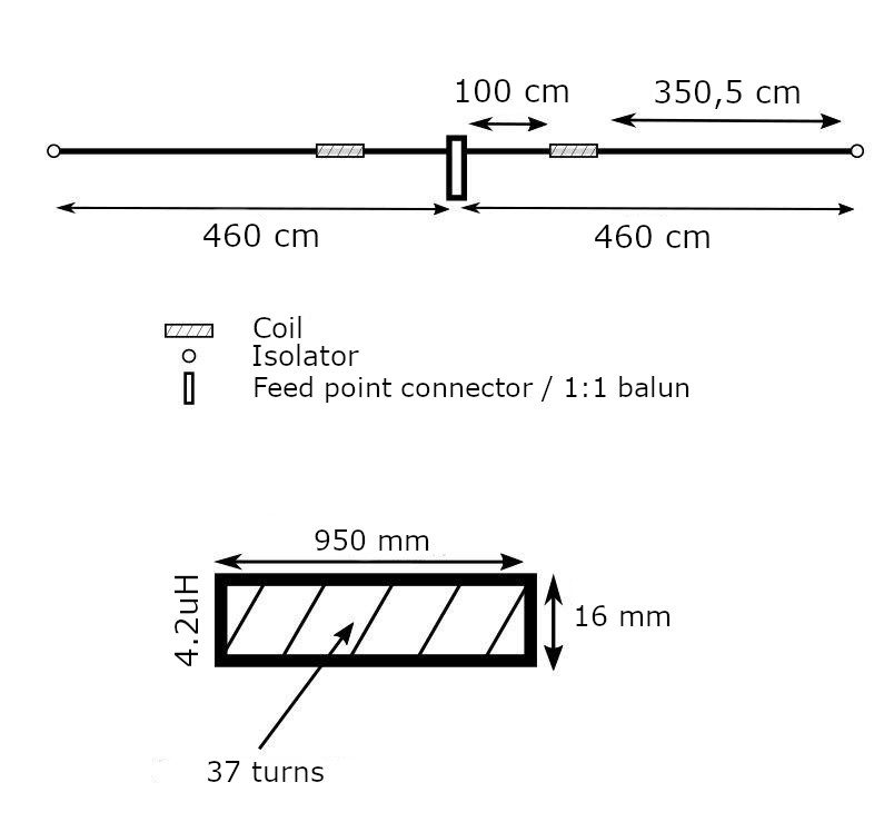 Connect 1 m antenna wire to each side of the feed point connector (or the 1:1 balun). Now solder the ends of the antenna wires to one side of each coil. Use shrink tubing to make it water resistant. Solder the 4 m pieces of antenna wire to the other side of the coils. Both ends should then be terminated with isolatiors. A good start for tuning is a wire length of about 3,60 m between coil and isolator. Wrap around the remaining 40 cm for the tuning procedure.