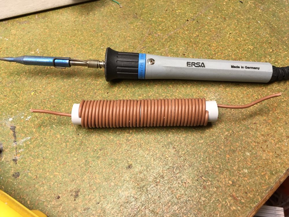 Drill a hole into the 16 mm installation tube and stick a few centimeters of the 1.5 mm2 wire through it. Afterwards tightly wind the wire around it 37 times. After the 37th turn, drill a hole closely to the wire into the tube and stick the wire through it. It now should look like this: