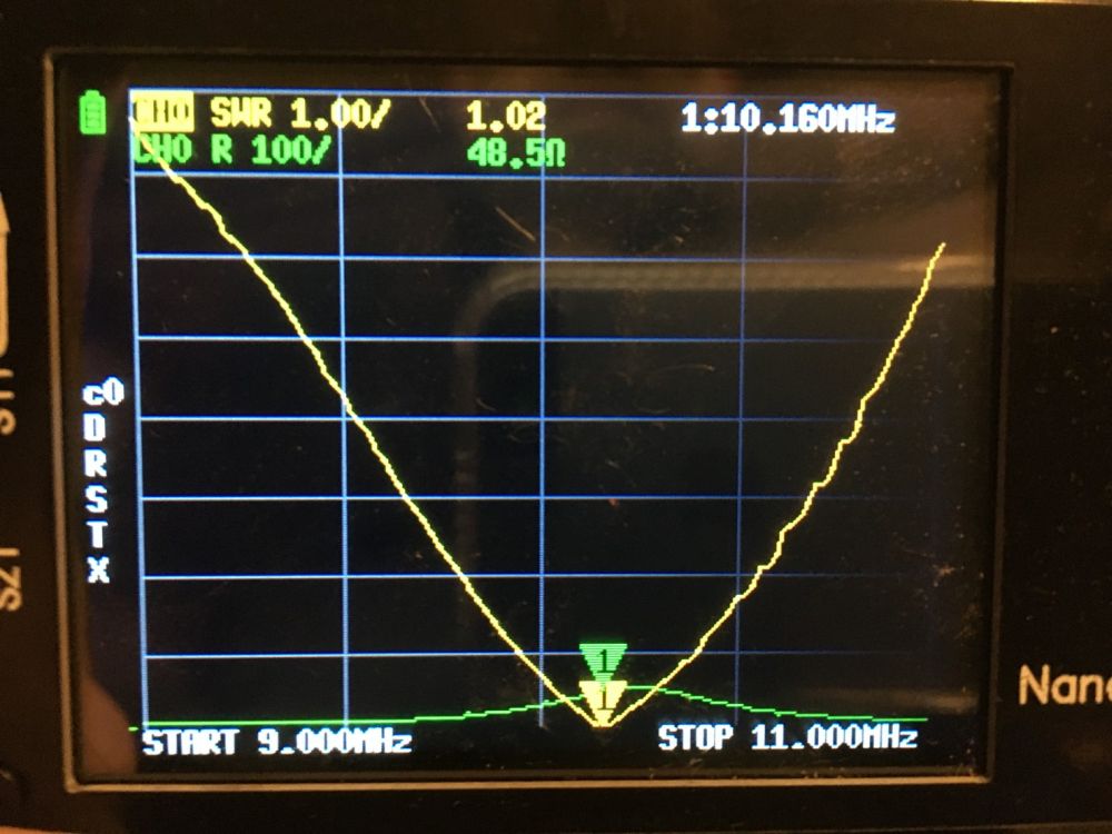 The antenna ended up being 9,30 m long (including feed point, excluding isolators). The following photos show how nicely this antenna can be tuned: