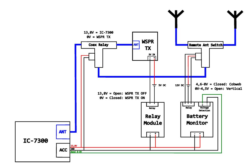 In other words: I’d like to fully automatically transmit WSPR packages via the Hustler 4-BTV when I am not using the station. If I am using it, the appropriate antenna for the current band should be selected.