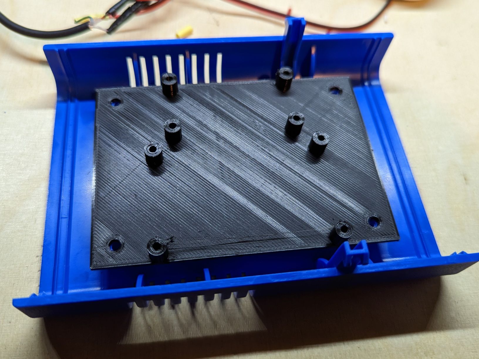 Both PCBs have been mounted on a custom designed and 3D printed adapter board which again has been mounted to the bottom of the enclosure.