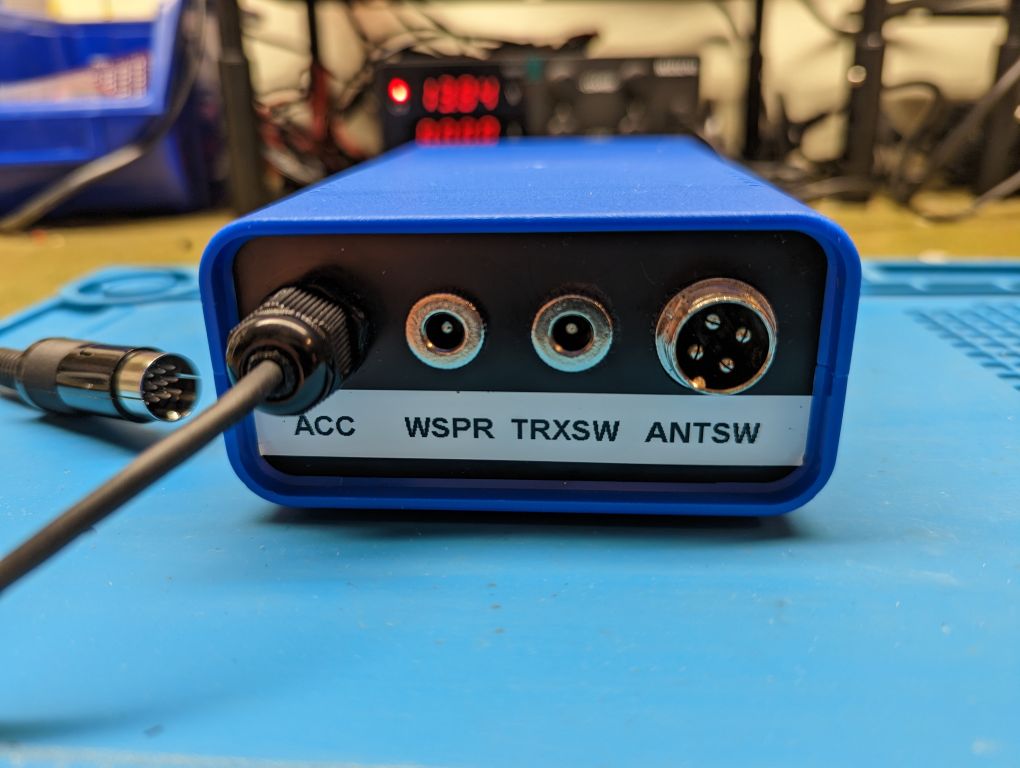 The IC-7300’s ACC port provides a 13,8V output pin which is specified to be able to deliver up to 1A. The shack antenna switch is directly connected to this pin and will therefore toggle its state depending on the power state of the IC-7300. The coax cables are connected in a way that the WSPR transmitter is selected when no voltage is applied to the coax switch.