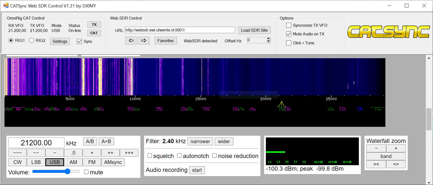 CatSync can be described as a wrapper/player for all those WebSDR instances that can be found here. It bridges your transceiver with a WebSDR receiver, letting you continue operating even when your local conditions are unbearable.