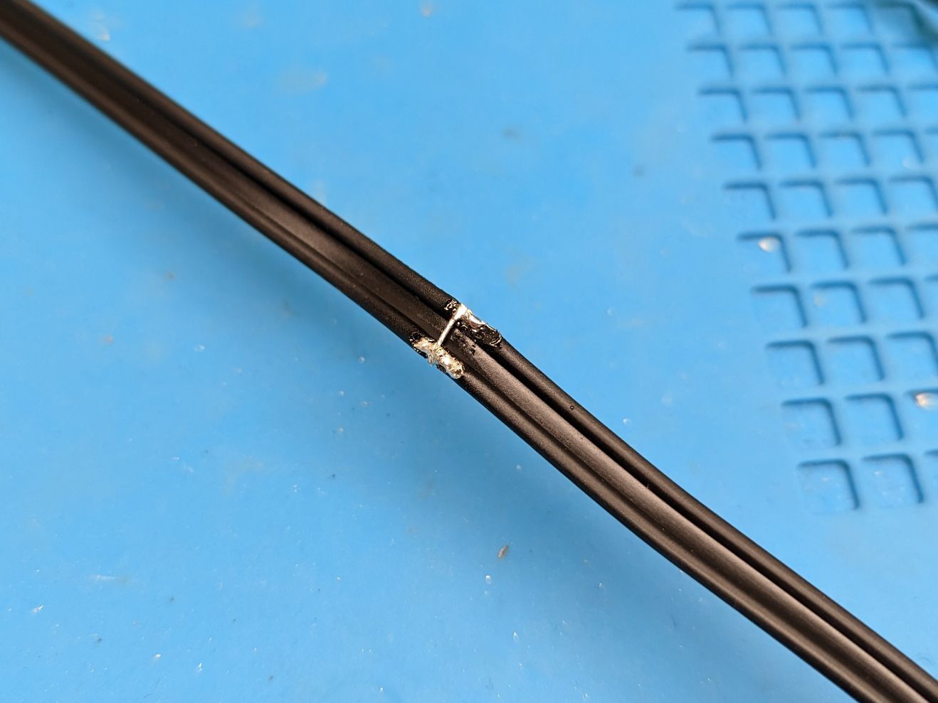 Then, following the instructions, cut out the two 5mm pieces from one of the wires, soldered the bridge further up and applied heat shrink tubing to all the modified parts of the cable: