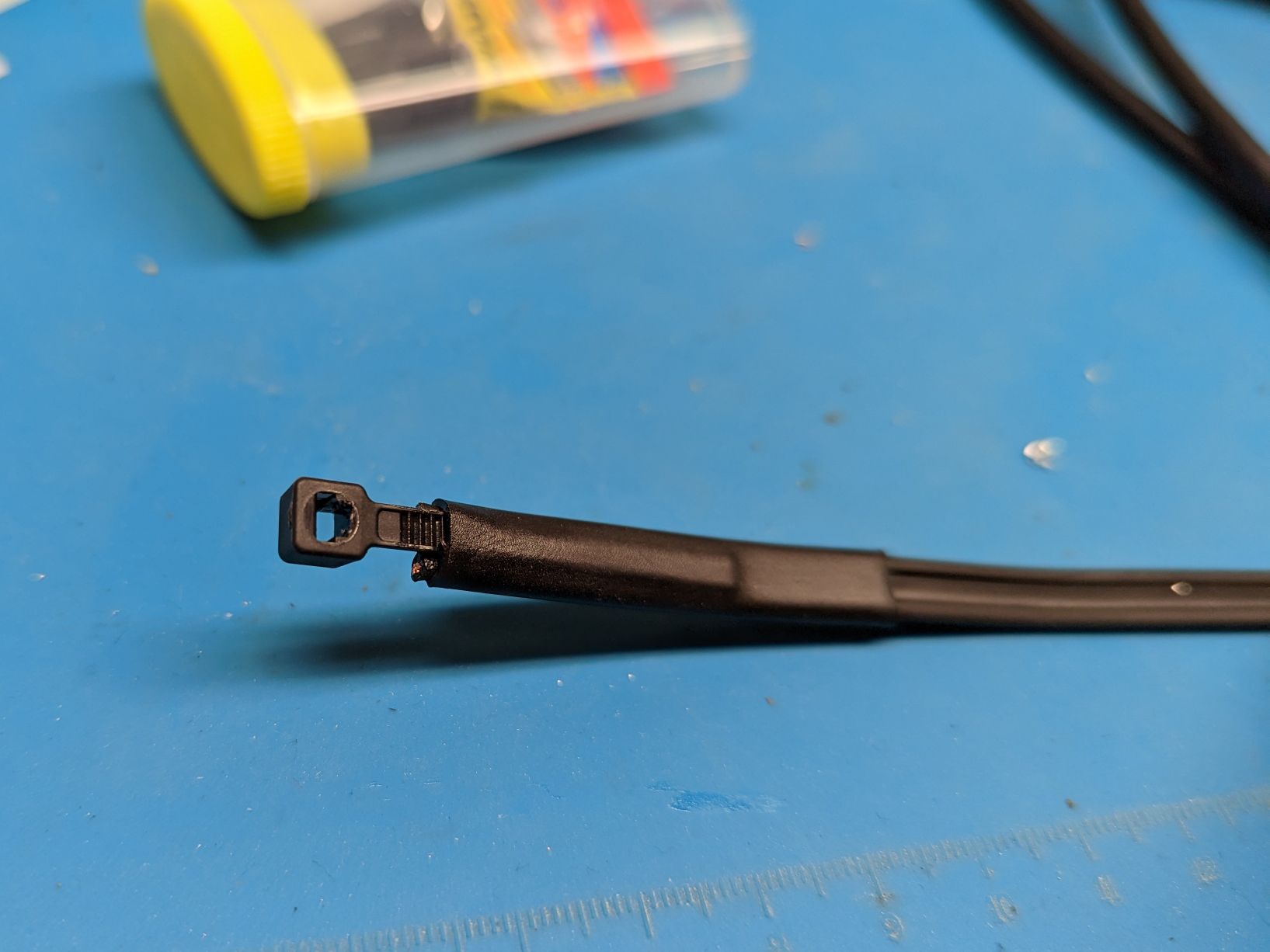At the top end I glued a cable tie into the 240 Ohm wire and fixed it with a heat shrink. I hollowed out the eyelet of the cable tie by cutting out the inner plastic part: