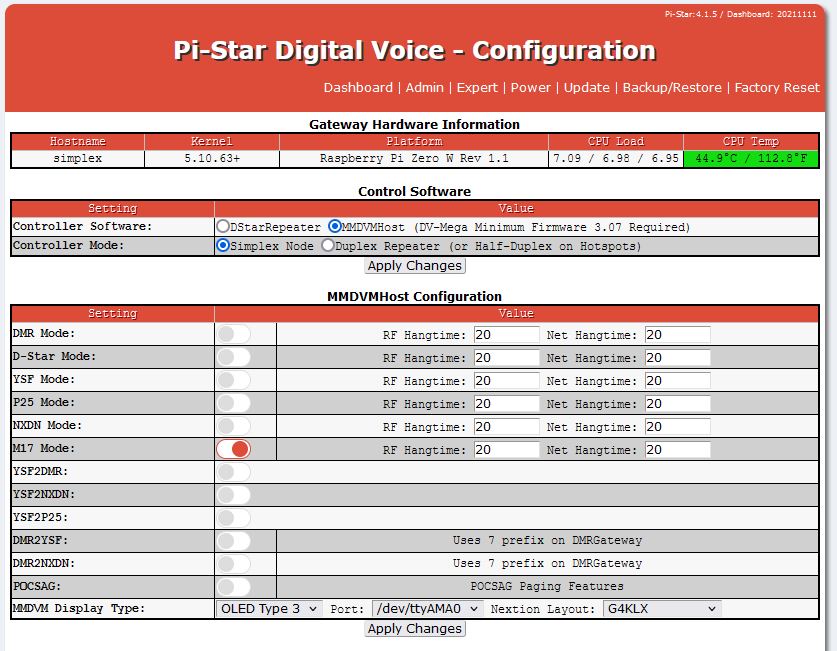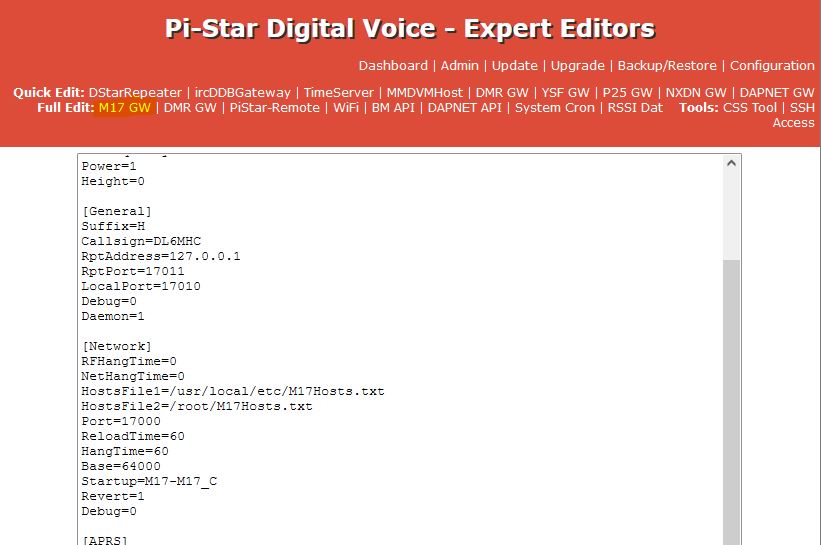 Afterwards, configure the M17 gateway service to your likings. You can find the settings under “Expert/M17 GW”. The URL is: http://<HOTSPOT_IP>/admin/expert/fulledit_m17gateway.php