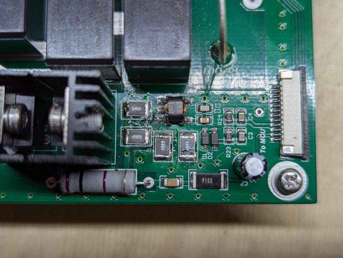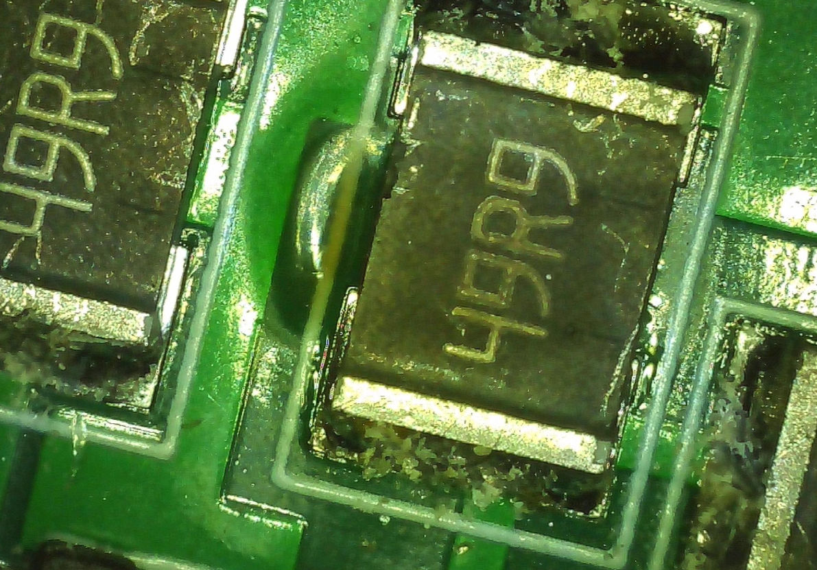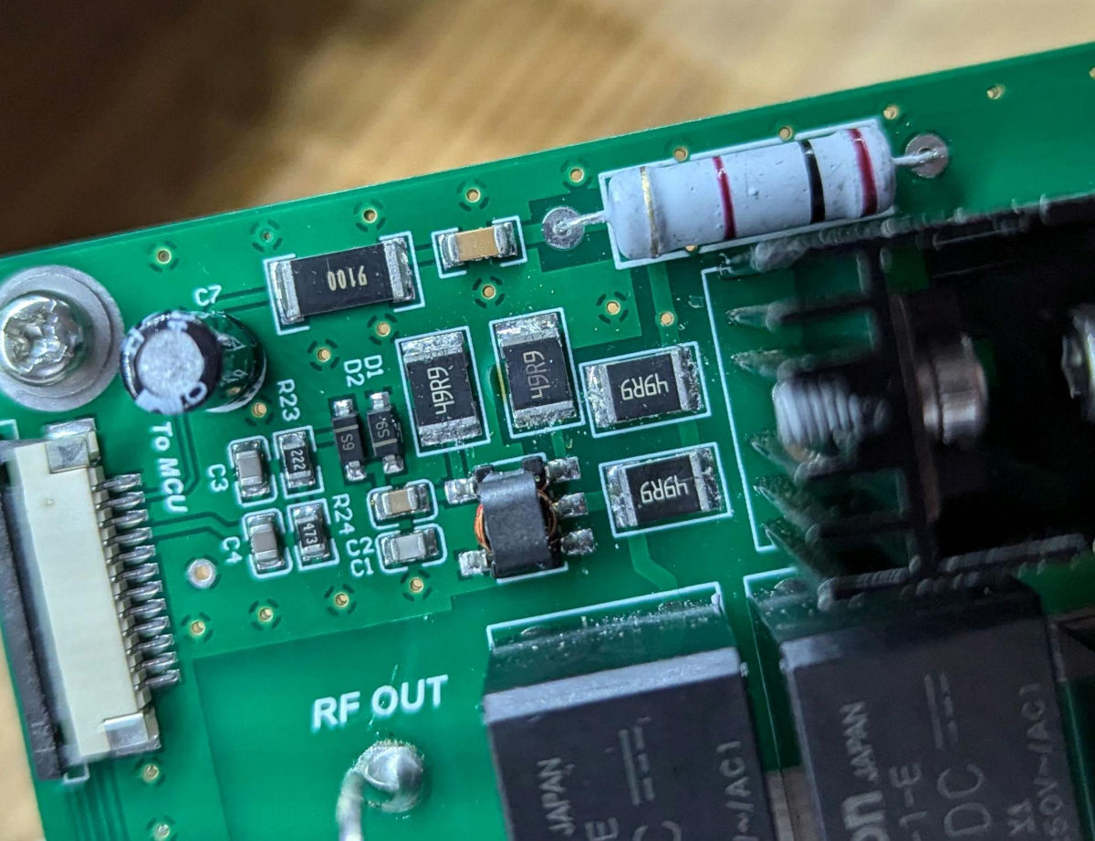 The affected 49,9 Ohm SMD resistors have a very uncommon size (1812) which I couldn’t find anywhere in the EU so I had to order them from Mouser in the USA. The package with 10 resistors (which then ended up costing 27€) arrived only 2 days later. I then soldered them back onto the board, which was not easy because of the two neighbouring heat sinks:
