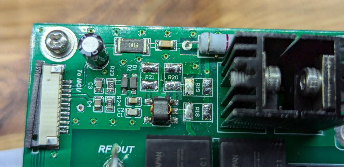 After reassembling everything, I’ve tested again and the result was sadly exactly the same as with the old 4 resistors R18 to R21. I’ve then talked to Mike, M0AWS and he suggested to see what these two heat-sinked components next to R18 and R19 are. So I’ve desoldered the sensor board again from the main board and desoldered the two components with the heat sinks. To my surprise these two components are also resistors (R1 and R2).
