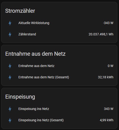 Home Assistant users who have a photovoltaic system but no two-way electricity meter can often unfortunately only read out the current electricity consumption, but not the energy fed into the grid. In the case of my meter, however, this value is positive when energy is taken from the grid and negative when energy is fed into the grid.