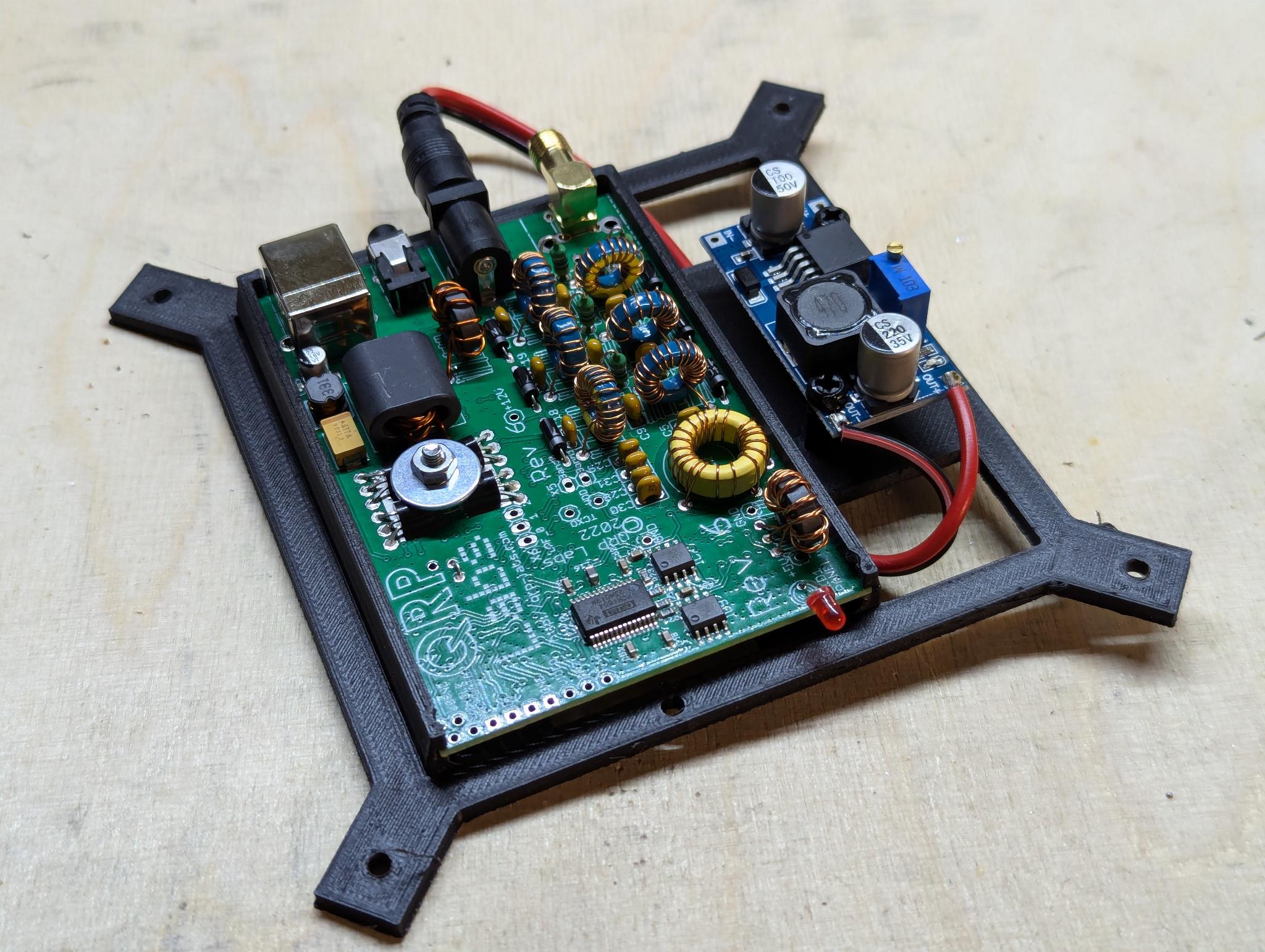 The finished QDX was then inserted into its module carrier. In addition to the QDX, a buck converter was installed on the carrier, which regulates the 13.8V for the QDX down to 9V.