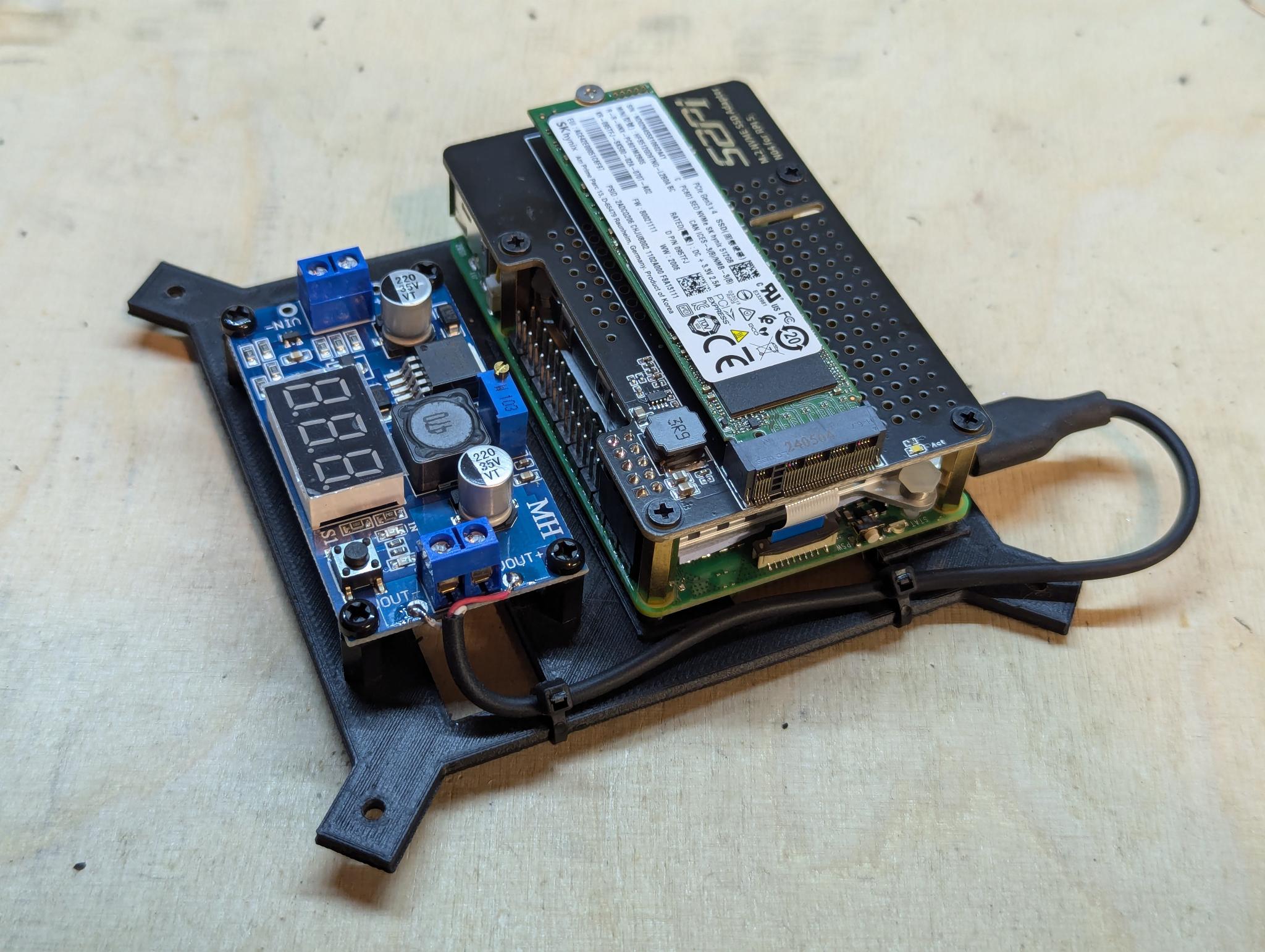 The Raspberry Pi was mounted together with the NVMe module in sandwich construction on the corresponding module carrier. There was still space next to it to accommodate a buck converter, which regulates the 13.8V down to 5V for the single board computer.