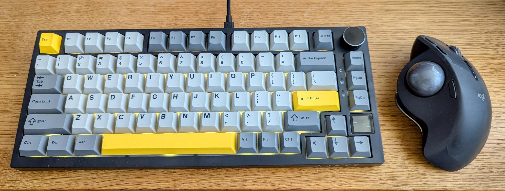 Posted on 2025-05-19I’ve been typing on computer keyboards for 35 years now, mostly on ISO QWERTZ keyboards because that’s what’s standard here in Germany and it was pretty much the only keyboard available when I started tinkering with computers. In recent years I have mainly used a Ducky One TKL keyboard with MX brown switches, which I have liked very much so far.