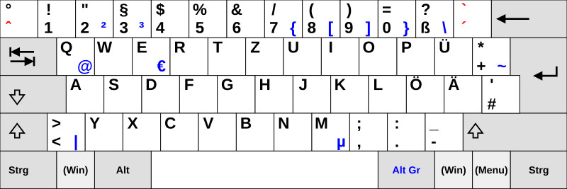 - With the QWERTZ layout, the characters {, [, ], }, \, |, ~ (amongst some others) are accessed by holding the AltGr key and pressing the other key. It is much more convenient to type these characters with the ANSI QWERTY layout especially when coding/scripting or working on the CLI.