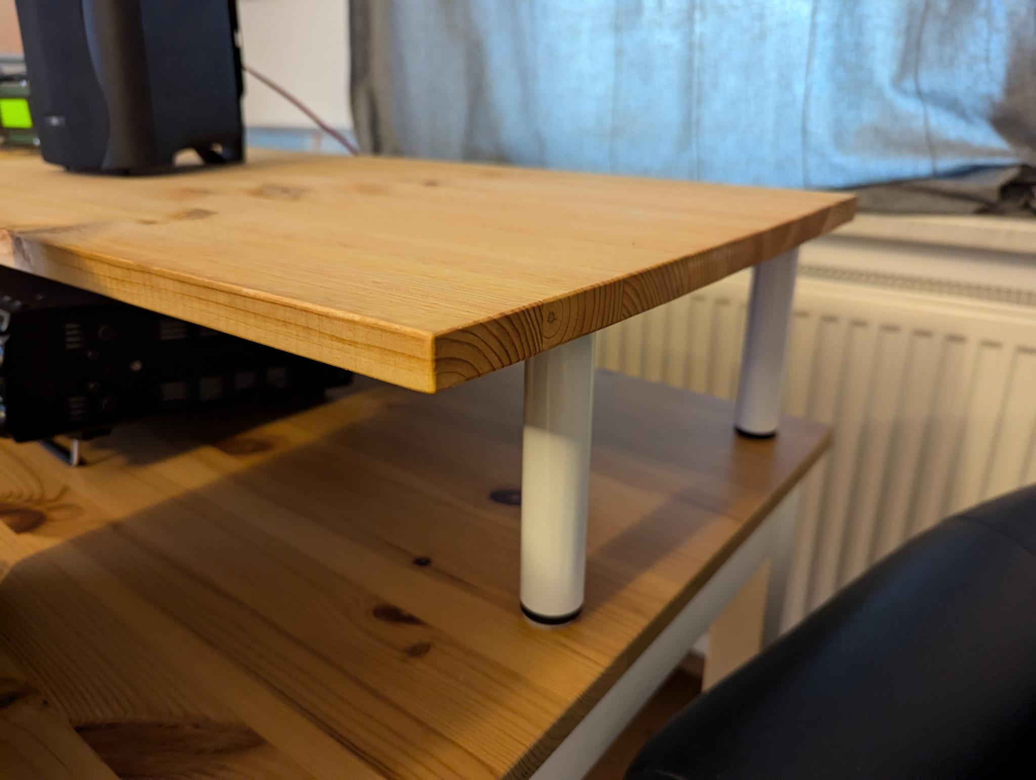 For this, I initially took a simple IKEA table that was 97cm wide and set it up where the empty conduit ended in the wall. A quick visit to the hardware store resulted in a pinewood board that was also 97cm long and 40cm deep, which I first oiled and then provided with four 15cm long white metal legs.