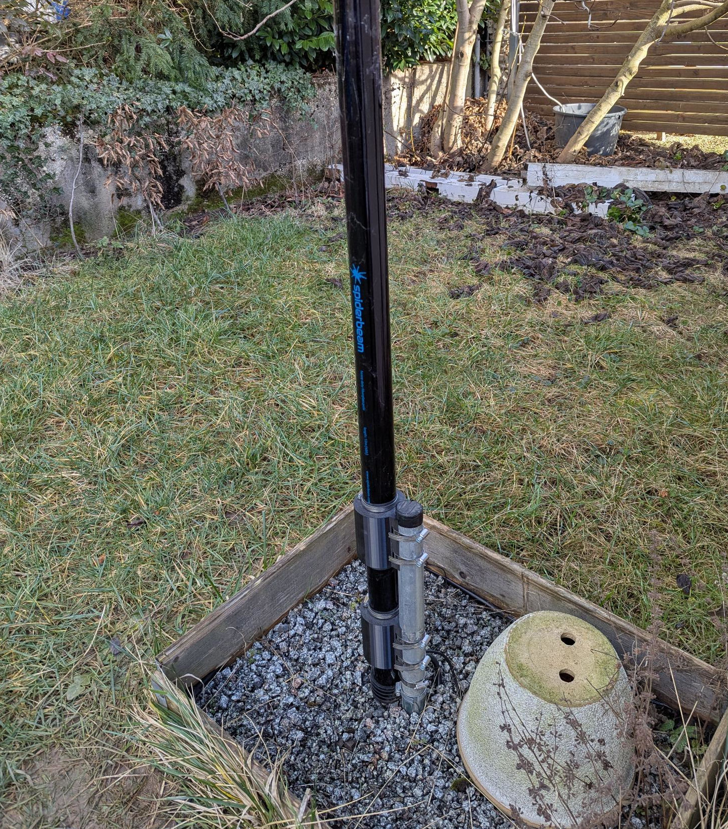 Posted on 2025-01-28After I had to take down my M0PLK Delta Loop, it was time to experiment with new antennas. In a corner of our garden, there has been a Hustler 4BTV vertical antenna for quite some time, which I have only ever used for 40m operation. Now I had the idea of replacing it with a 1/4 wave vertical antenna for the 40m band. The matching radials for this were already under the turf, so I only had to swap the Hustler for a 10m mast. I finally decided on the HD version of the 12m Spiderbeam fiberglass mast, from which I simply removed the top two elements to get the desired 10m. Unfortunately, I only had a short steel mast stub with a diameter of 42mm available for mounting the fiberglass mast. A first setup, in which I attached the mast with a tensioning belt, unfortunately did not last long.