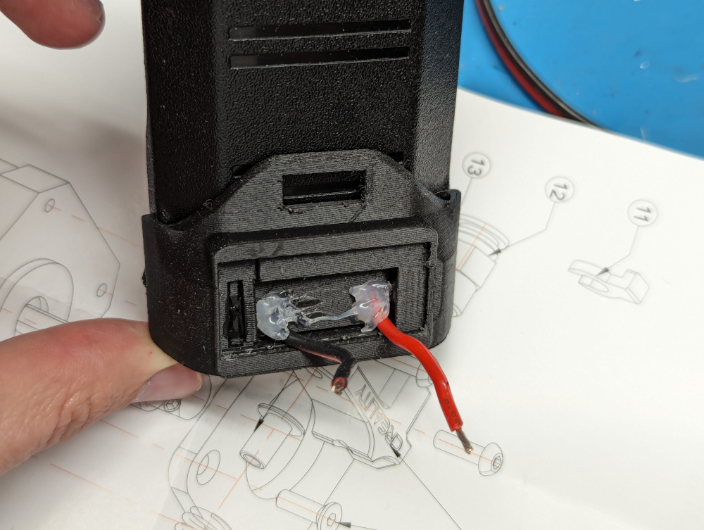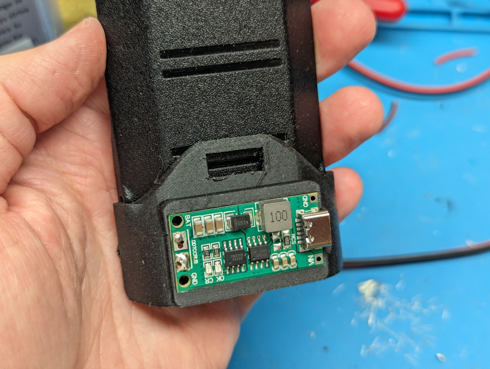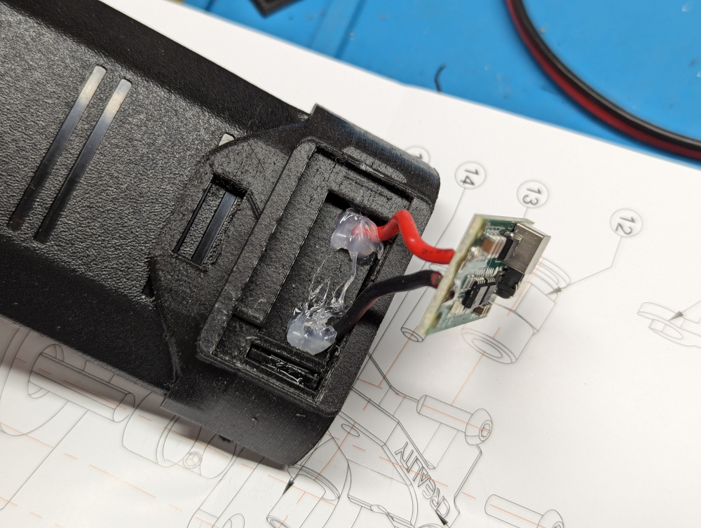 The prepared component was then glued into the printed part “Charger” with superglue. Once the glue had hardened, I cut the wires to length and soldered them to the 2S 2A USB-C charger PCB: