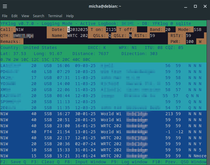 Posted on 2025-03-13I think I’ve tried pretty much every amateur radio logbook software (including one for the Commodore C64) and I’m probably still not at the end of my search. Most of the time I used Wavelog. This web application, which I have running on a Proxmox server at home, actually fulfils a lot of my requirements: web-based and therefore usable on my Linux desktop, open source software, many integrations and is actively being developed further. However, the fact that I have to operate a radio, a keyboard and a mouse when playing radio has been annoying. That may sound a bit petty, but I see potential for improvement. I myself have always had a soft spot for text-based command line applications and have also used the YFKlog logbook software written in Perl in the past. At that time, integrations with eQSL, QRZ.com etc. were still very important to me, which is why I eventually switched to Cloudlog and then to Wavelog. In the meantime, QSL is no longer important to me and I don’t really hunt DX anymore. That’s why I ended up back at YFKlog: